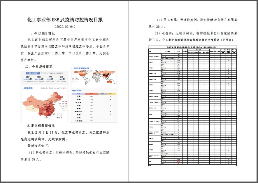 化工事业部实施HSE及疫情防控情况日报。各单位组织排查统计“四类重点”人员、家属及承包商员工健康情况,每日汇报,进行动态管理。