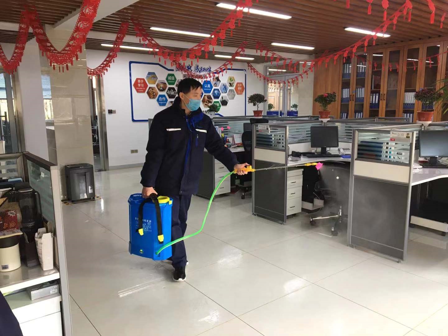 山东华鸿党员李祥是公司夜间总值班,每次夜班值班结束后,他总是主动对办公大厅各个角落进行消毒处理,为下一批值班人员创造健康安全的工作环境。