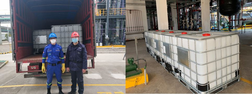 2月1日,中化蓝天上虞基地向绍兴市上虞区人防蓝天救援队捐赠5只崭新的吨包装桶,用于公安、消防等相关政府部门盛装消毒使用的储备物质。